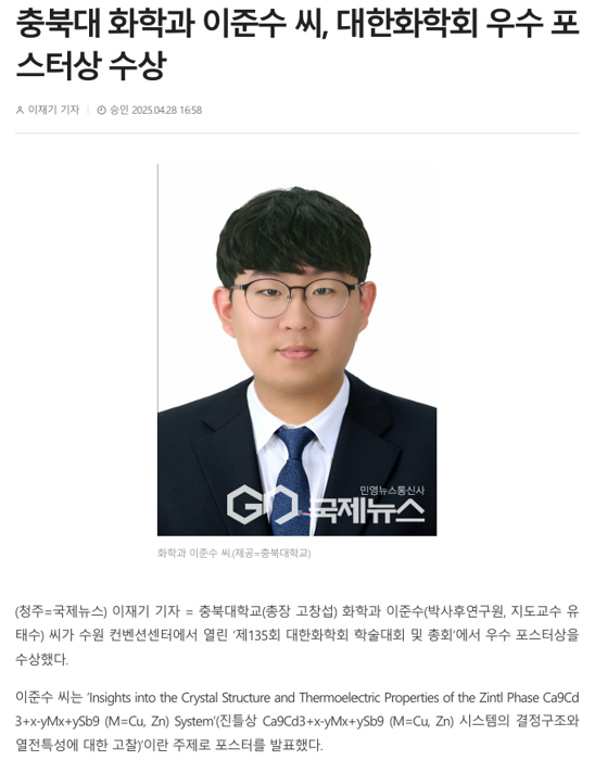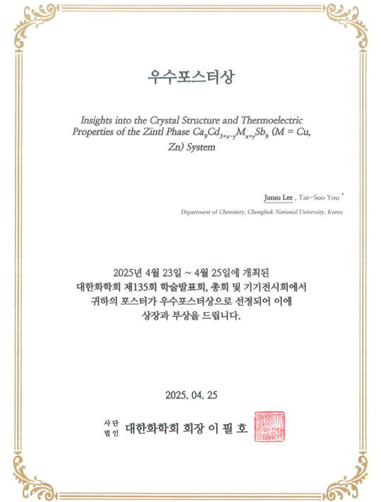 2025년도 춘계 대한화학회에서 우리 그룹 이준수 박사가 우수포스터상을 수상하였습니다. 축하합니다!!