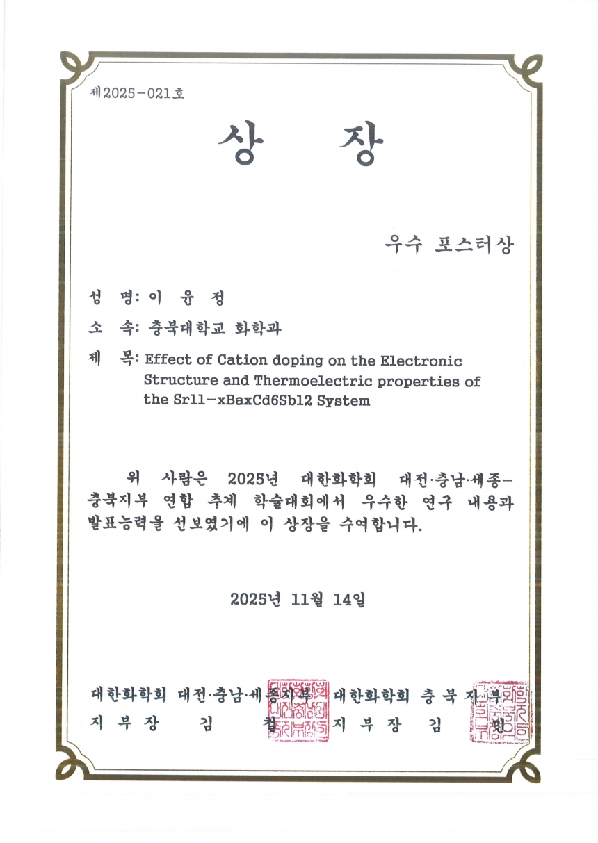 2025 대한화학회 대전·충남·세종-충북지부 연합 추계 학술대회에서 우리 그룹 이윤정 학생이 우수포스터상을 수상하였습니다. 축하합니다!!